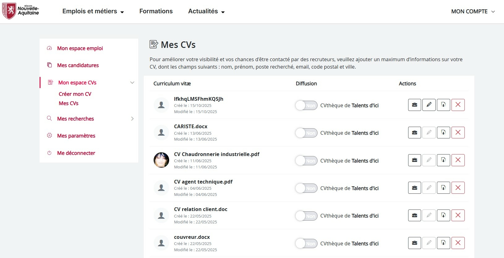 - Publier ou retirer vos CV en un clic : vous décidez quels CV sont visibles par les recruteurs et recruteuses. Une flexibilité idéale pour cibler vos recherches ou mettre à jour vos informations sans précipitation.